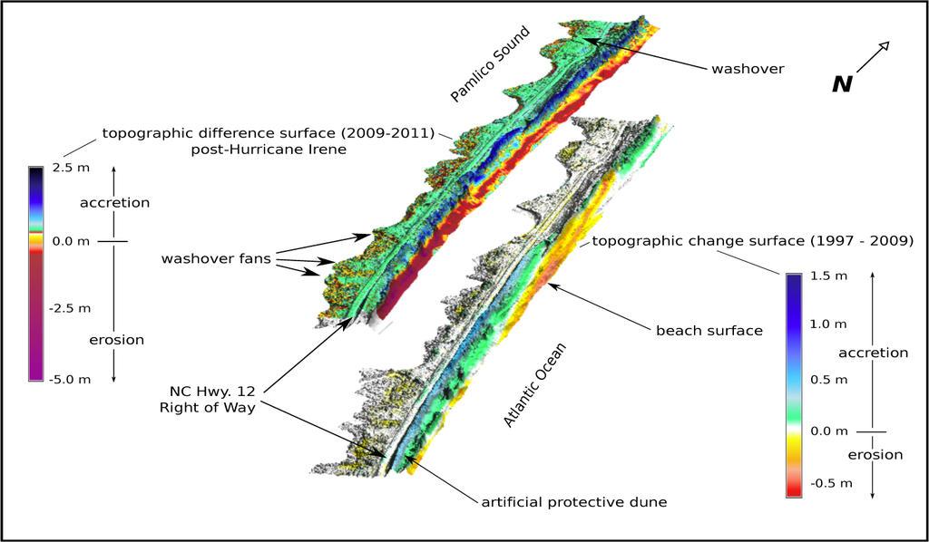 The difference surface between the 2009 and 2011 for the Hatteras Island site is shown in the upper model seen in Figure 7. Much of the ocean beach, and particularly at the south end of the study site (dark reds and violets), experienced high erosion (>2.5 m in some places) during the interval, while the tops of the dune system recorded gains (shown in blue). Behind the dunes, washover fans and terraces are conspicuous along the island. Additional deposition is also noted all across the NC Highway 12 right-of-way.