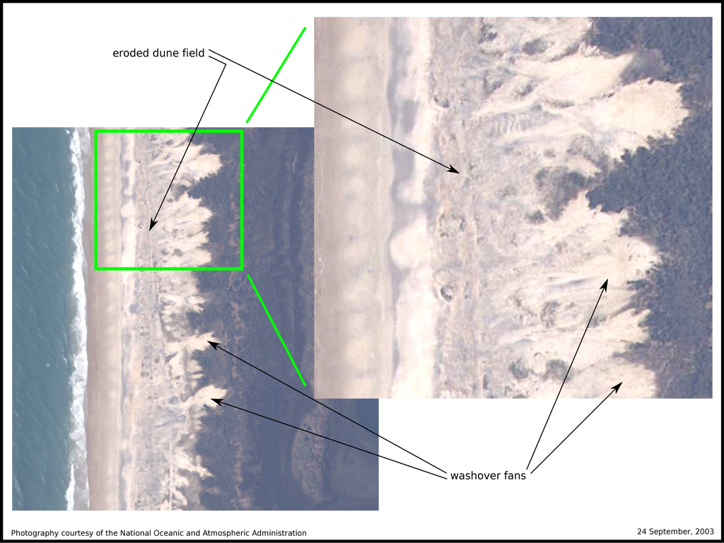 The dunes that run the length of Hatteras Island, and much of the Cape Hatteras National Seashore, present a largely impermeable barrier between the ocean beach and the remainder of the island. Only during high energy storm events are these sometimes 8 m-high features breached and washover sands transported across to the rear of the island [30]. Further, when overwash does occur, the North Carolina Department of Transportation is quick to return much of this material back into a newly reconstructed dune system. Thus, under most situations, wave energy, and the concomitant active erosion/accretion zones, are confined to the beach and along the seaward-facing fore dune wall. The lack of counterpoising washover deposition has resulted in excessive narrowing along this segment of Hatteras Island [30]).
