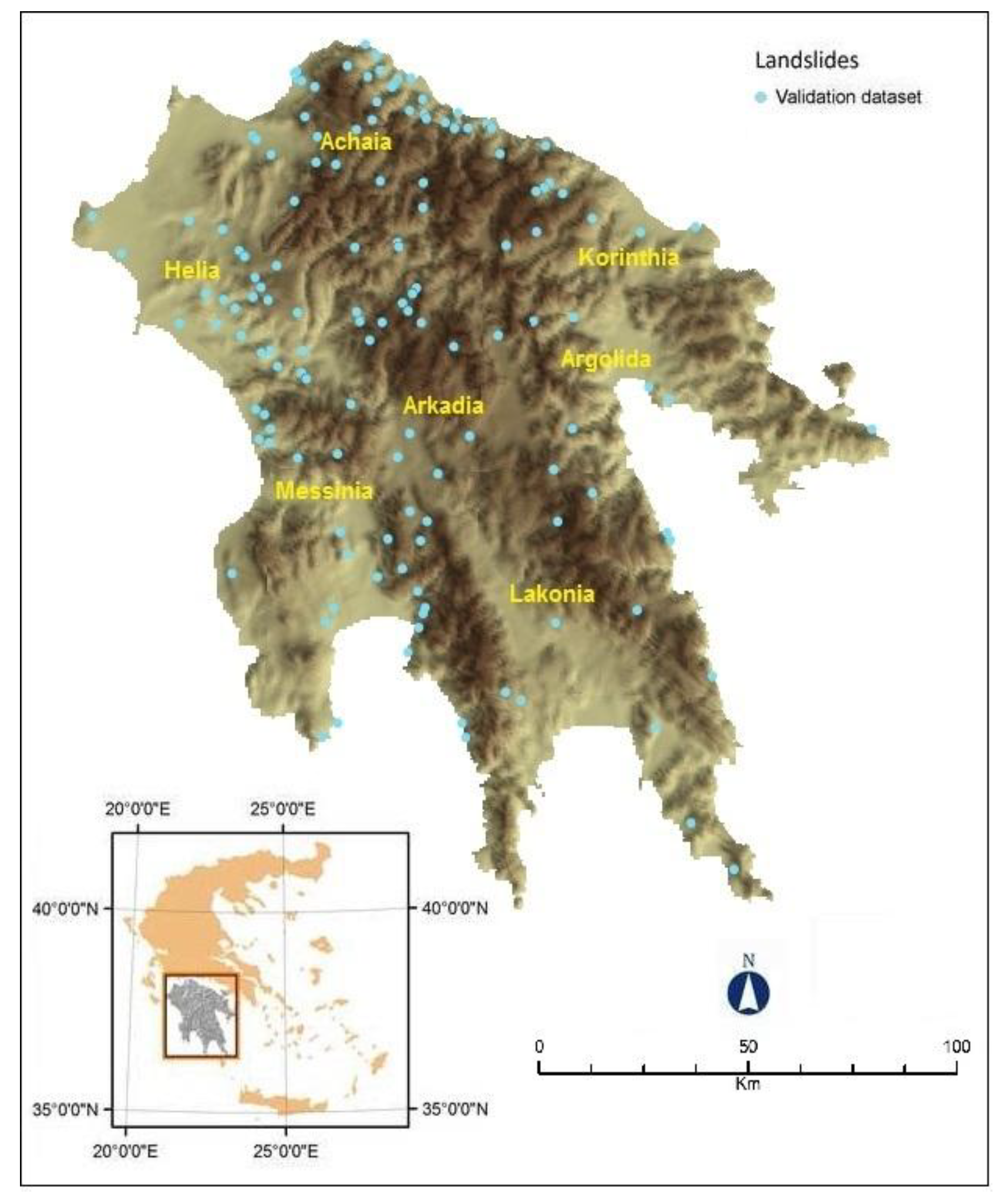 The location of the study area (Peloponnese peninsula) and the landslide validation dataset.