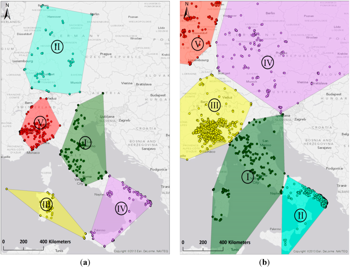 For the data preparation, line geometries for ways were replaced with their midpoints. Further, each feature was mapped only once, even if it had several versions in the history dump file. We tried different k-values (i.e., spatial clusters) for nodes and ways of each of the 13 contributors, and started off with relatively small k-values (in the range of 5–10) that seemed to visually provide a meaningful spatial grouping of nodes. Later on, in combination with step 2 of the clustering approach, we increased k-values to be able to obtain a more spatially refined delineation of the home region. Figure 2 shows the regions generated through k-means clustering on nodes (a) and way midpoints (b) for one of the selected 13 contributors.