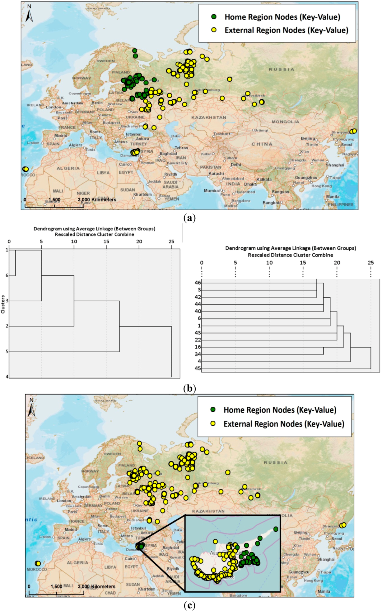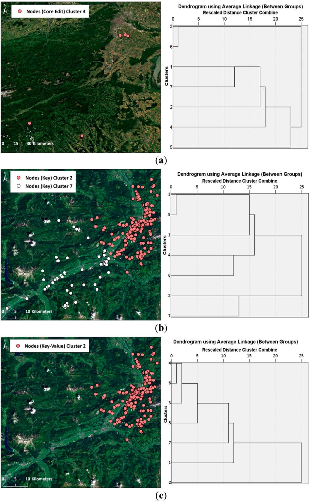 Figure 3 shows point clusters and dendrograms as a result of the hierarchical clustering process of node edits for one selected contributor, using core edits (a), keys (b) and key-value pairs (c). We considered those cases of the dendrogram as home region that were part of the two final clusters in the agglomeration schedule and within the cluster containing the smaller number of cases. In this example, the core edit information identified two smaller clusters as home regions, which include one somewhat dispersed cluster in eastern Austria (Figure 3a) (cluster #3, 8 points) and one in the US (cluster #6, 1 point). This seemed unlikely to be a home region both based on the spatial distance between the two clusters but also because of the small number of nodes in both clusters. This example demonstrates a limitation of the proposed clustering approach, which is that k-means groups consisting of very small point numbers may have a distinct profile due to a few edits which are then in the hierarchical cluster process identified as home region. Thus, one should keep a minimum number of points in each k-means region before the hierarchical cluster analysis.