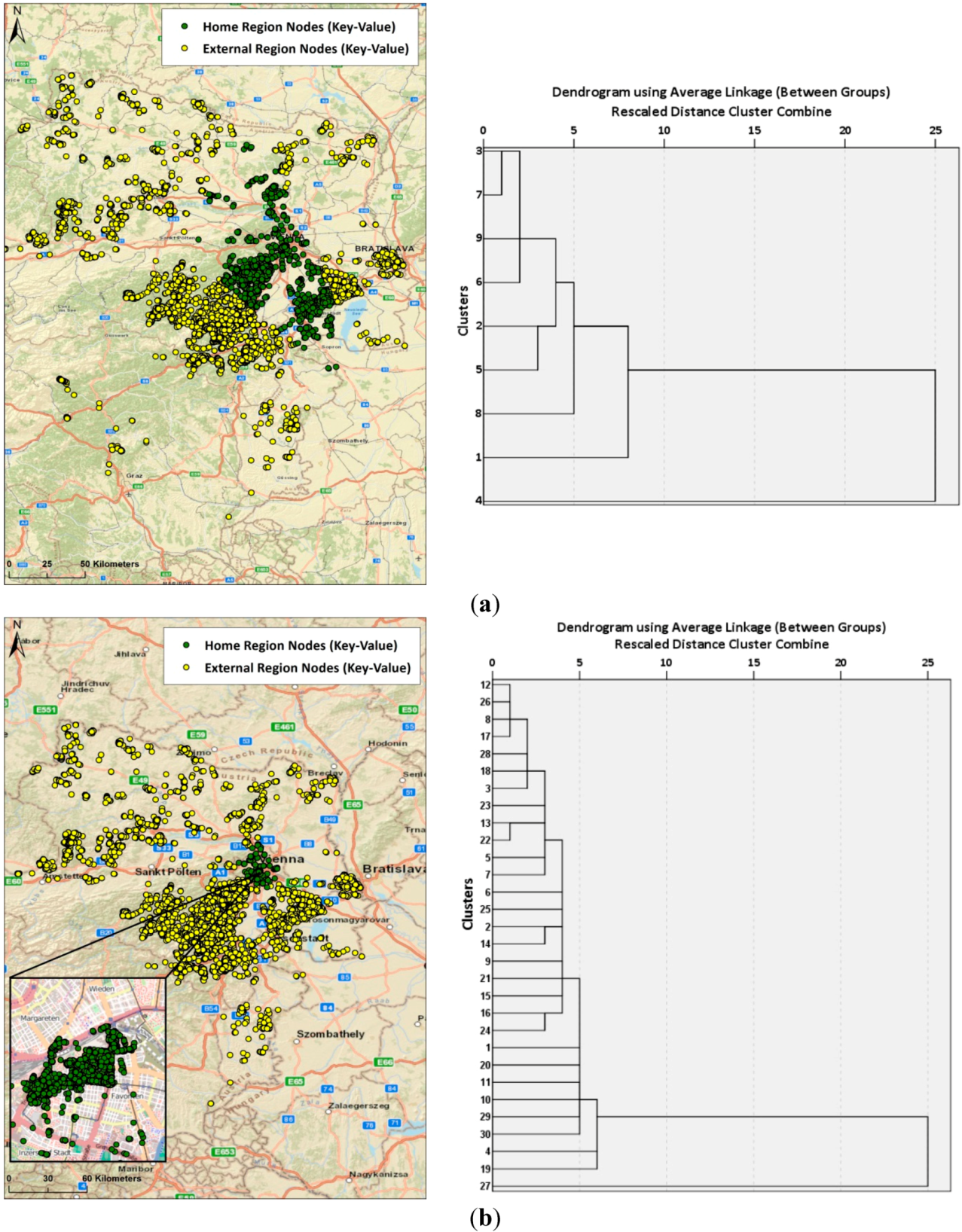 A perfect spatial overlap between the two-tiered cluster method and the triangulation method cannot be achieved due to the arbitrary choice of k-means cluster regions in the first step, which determines the spatial resolution of the hierarchical clustering step. For example, in Figure 5a the identified home cluster for nodes (green) based on a low k-value of nine covers Vienna (Austria) and its surroundings (cluster #4), whereas Figure 5b with a larger k-value of 30 narrows down the home region to a few city districts (cluster #27), matching the information provided by the contributor during the email exchange more closely.