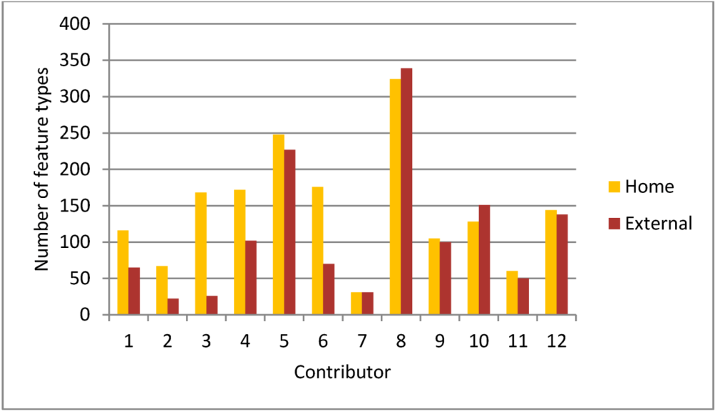 After the areal delineation of the home and external regions, it was analyzed how many different feature types were edited and on how many days edits were performed in the home and external region for each contributor. A larger diversity of features would imply that the contributor collects more details for a particular area of interest, representing the local knowledge that many VGI enthusiasts consider as one of the main advantages of the OSM project. It needs to be pointed out that feature type diversity is not equally distributed between different geographic regions. More specifically, feature diversity, e.g., measured by variety of amenities, is larger in urban environments than in less populated rural areas. Thus, an OSM contributor exhibiting a larger diversity of mapped features in a home region that is located in an urban environment compared to external regions located exclusively in rural areas would not necessary reflect a higher level detail of data collection effort in the home region, but be a product of the natural distribution of feature diversity. However, each of the selected 13 mappers, since being highly active, contributed data in several distinct densely populated areas. Thus, a larger variety of mapped features in the home region (which comprises typically only one city or city district), indicates in fact a more detailed mapping effort than in external regions, which in our analyzed cases, also include (other) urban areas.