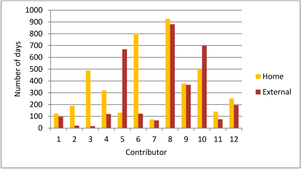 The analysis of node feature diversity in home and external regions revealed that most contributors edited a larger variety of features in home regions than in external regions. This pattern supports the local knowledge connotation that many claim as one of the main advantages of VGI projects, such as OSM. Local knowledge can be obtained from being on-site, allowing for more detailed data collection efforts than mapping from satellite imagery. Similarly the temporal analysis, focusing on the number of days a contributor dedicated to mapping efforts in each region, showed a larger value for home regions than external regions for almost all contributors.