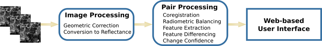 The Geospatial Change Detection and Exploitation System (GeoCDX) is a sensor-agnostic change detection system for high resolution remote sensing imagery [2]. GeoCDX automatically ingests imagery from a variety of sensors, including IKONOS, QuickBird, GeoEye-1 and WorldView-2. Once ingested into the system’s catalog, a data-specific processing plan is developed based on the characteristics of the imagery. The first step of this processing may involve steps, such as geometric correction and conversion to top-of-atmosphere (TOA) reflectance, if they are appropriate for the imagery. The system automatically determines which temporal pairs of images can be created when new imagery is ingested; this also creates a processing plan for each pair. This fully-automated plan includes image-to-image coregistration, radiometric balancing, high-level feature extraction, differencing of the extracted features and fusion of the difference images into a single change confidence image. A summary of these processing steps can be found in Figure 1.