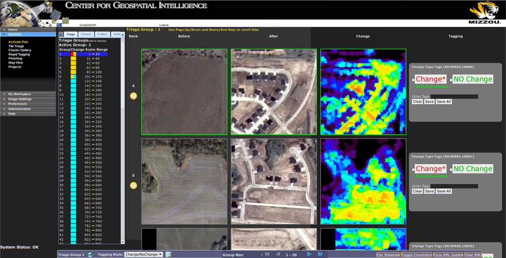 Tiles are then ranked using this change score from most change to least change and presented in rank order in a web interface. Users are then free to exploit the tiles that have been determined to have the most change and stop their analysis when they no longer find a relevant change in the results. An example of highly-ranked change results in the GeoCDX web interface can be seen in Figure 2.