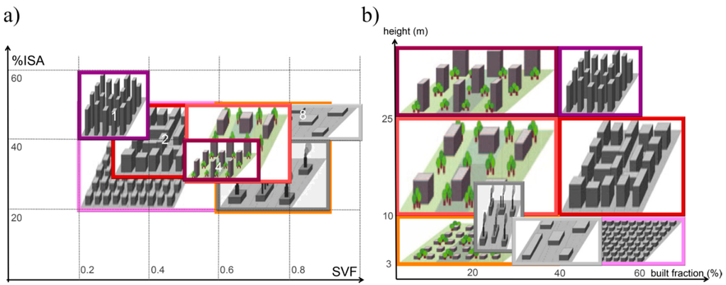 Figure 2 provides a representation of LCZs by selected characteristics, namely sky view factor (SVF) and the percentage of impervious surface area (%ISA) (left), as well as height (representing the urban structure) and building fraction (representing urban cover) (right). This demonstrates that several features are needed while not all features are equally important for discrimination. Furthermore, not all features can be observed directly by Earth observations. Thus, it requires us to determine which observable spectral characteristics can be used to substitute them.