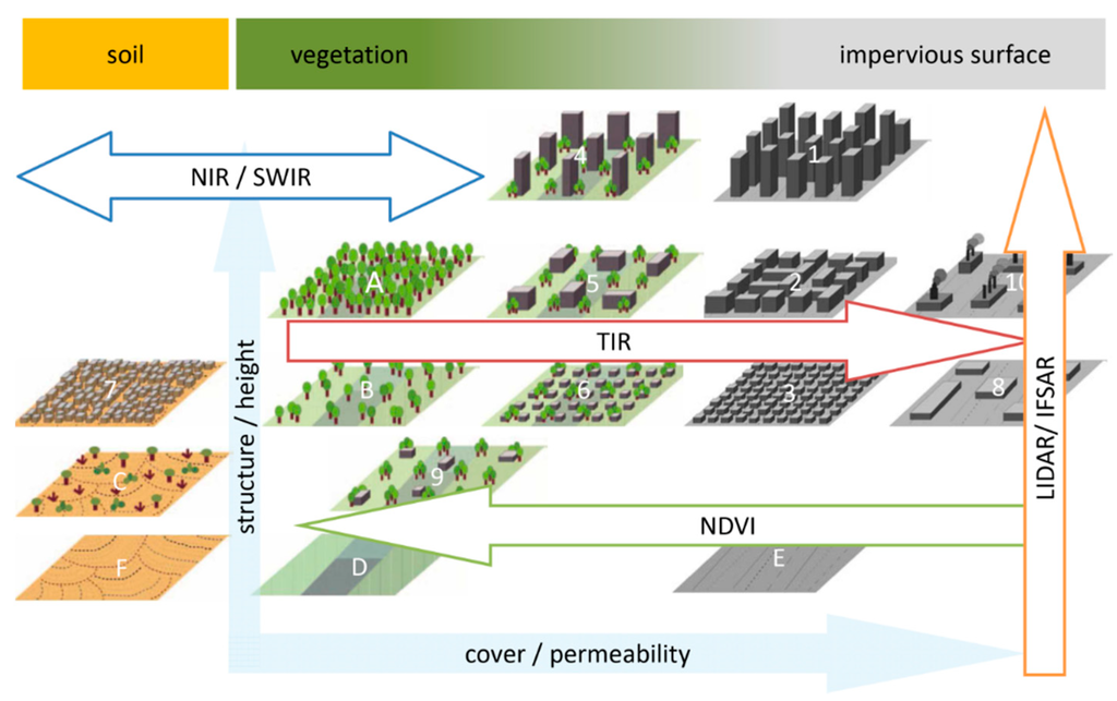 Figure 3, the LCZ scheme was sorted in a simplified manner along two axes representing height as the most important characteristic of urban structure and permeability as the most important characteristic of the urban fabric and cover. The arrows indicate potential wavelength bands and features for discrimination. While bare soil and sand can be well distinguished in the near and shortwave infrared, the compact and open LCZ can best be distinguished by their vegetation fraction using NDVI or fractional cover. Furthermore, the imperviousness is well correlated with land surface temperature [