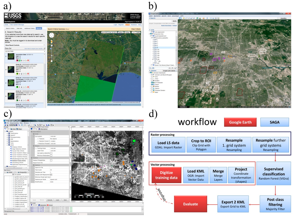 Overview of the mapping procedure. (a) Acquisition of Landsat data in USGS Earth-Explorer; (b) digitization of training areas in Google Earth; (c) classification in SAGA-GIS; (d) workflow.
