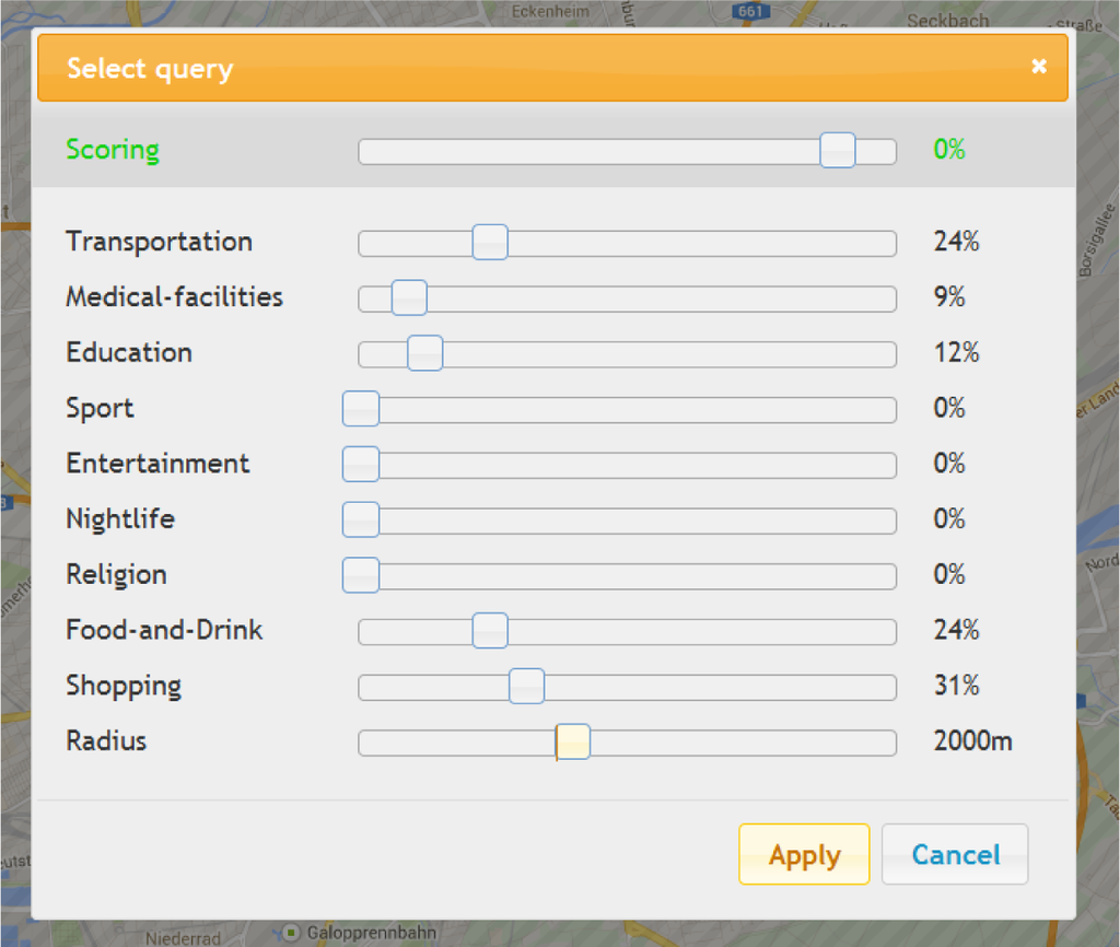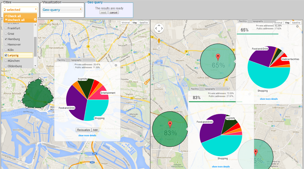 In various decision making situations users not only need to explore various regions of interests for the existing facilities, but need to compare and find relevant regions to their criteria of interest. In such scenarios, users could specify their requirements by one of the input methods described in Section 4. With respect to the input query, users could either select few target regions that need to be ranked, or ask the system for most appropriate region in a geographic space such as city. The search system shows the relevance of target regions by the percentage of similarity with the heatmap based relevance visualization. We used a color scheme of different green tones, which differed in their transparency. While light colors represented low relevance, dark colors were used in order to indicate high relevance.