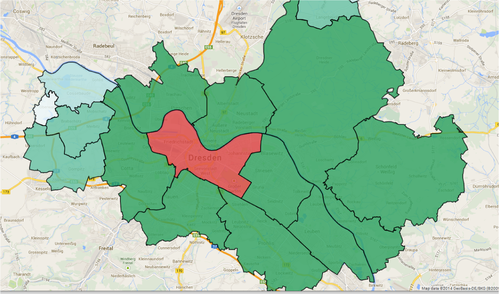 In addition to the search for multiple criteria, users might want to interact with the map interface to select an area on the map for regional exploration. Most of the current geovisualization interfaces focus on administrative map boundaries. Figure 2 shows the administrative map of Dresden city, where the users could select particular district areas of the city for exploration and comparison. In the shown example, the user selected a district in the center of the Dresden city map.