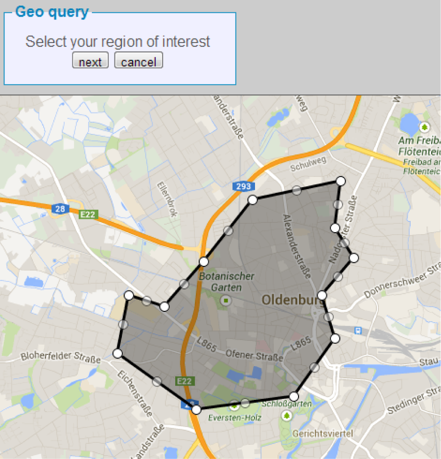 Moving beyond the traditional map boundaries, we offer users the ability to arbitrarily define their own spatial region of interest. The free definition of the query region is important, since users may not always want a neighborhood that is defined by traditional boundaries, e.g., a user might be interested in a particular region because of personal geographic preferences, such as the presence of a river nearby, a garden, a church and good connectivity to public transport. Furthermore, from our previous GIR research [15], we got the impression that the user of a geo search system needs more control of the input parameters. In particular, a free drawing technique has been desired several times, e.g., to encircle certain areas on a map, which then serves as a new reference point for further analysis. We therefore proposed geographical queries in our model by spatial example, where users can define the query region by drawing on map. The user could select the area via circular or polygon boundaries. Figure 3 shows an example of a user-selected region of interest via a polygon query (by mouse clicks and drag) on the map.
