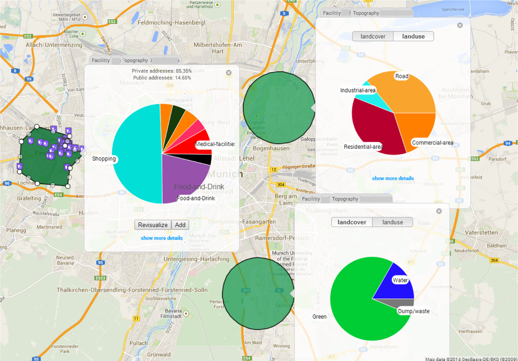 In the proposed visual interactive system, users could choose a particular city or multiple cities for spatial exploration. Users could select multiple regions of interest via polygon/circular selection or the administrative districts of the city map. Figure 4 shows the web interface for spatial exploration of the proposed system, where Munich has been selected as the reference city. Each region could be explored via multiple visualizations with tab views. The example shows three different regions of the city via different facets of the OSM data source. End users could visualize the spatial summary of geographic regions and cities based on a categorical heat map overlay on the extracted data, which consequentially allows them to explore and compare the selected regions. The pie charts provides the detailed information of the categorical distribution of regions when the users hover over it with a mouse cursor. This provides the detailed information on the availability of geo-located facilities in the selected regions.