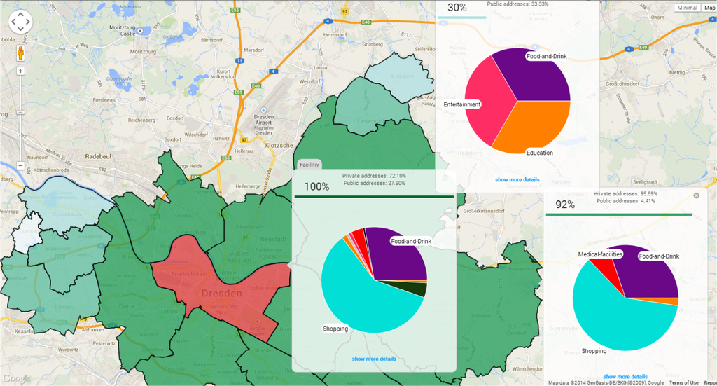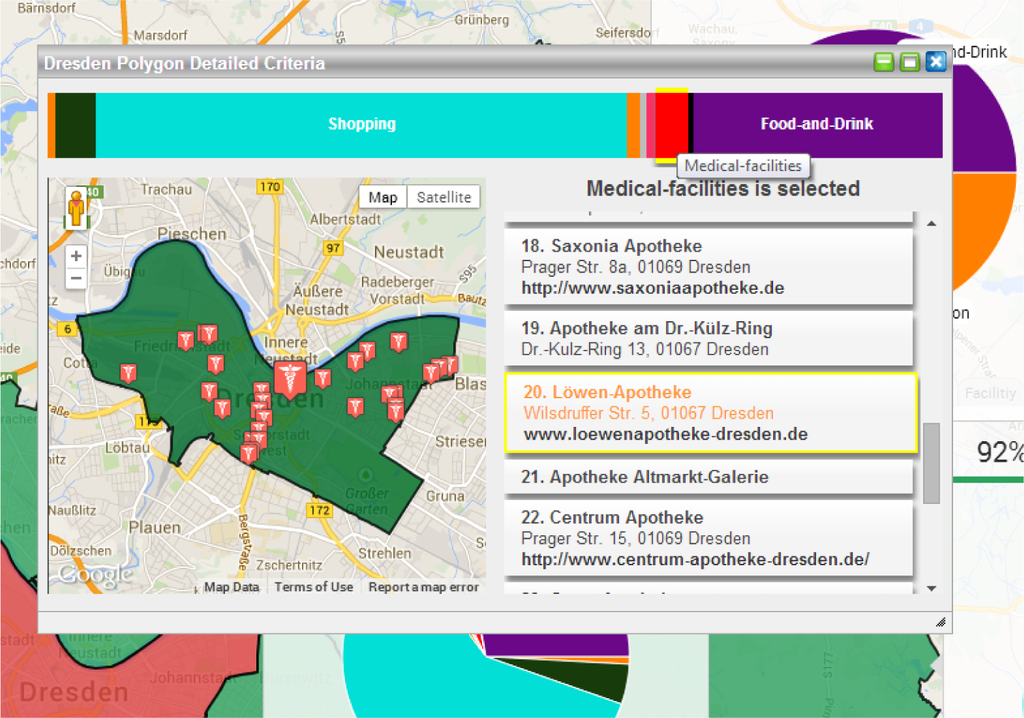The pie chart visualization provides a quick overview of the distribution of geo-located facilities. However, a user might like to explore the detailed information about the facilities and topographic distributions. In such scenarios, the user could click the “show more details” option at the bottom of the pie chart window. Figure 6 shows the detailed view of the central district of Dresden. When a user selects a particular category, all the geo entities associated with the category get listed, and also shown by icons on the map. We provide all of the specific information, such as name, location and website information, about each geo entity.
