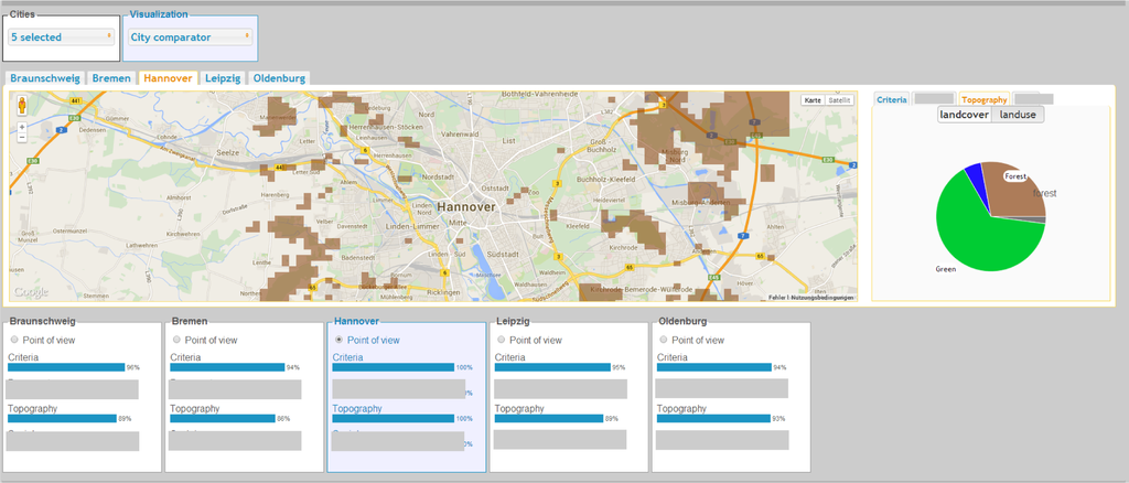 In some scenarios, people like to visualize the infrastructure of whole city and compare the city-based distribution rather than some selected regions [33]. We extend the regional explorative interface for city-based comparison to cater such decision scenarios when citizens need to explore and compare various cities. Figure 7 shows the example of a city-centric overview and exploration based on the aforementioned OSM categories. The user could select a city or multiple cities for spatial exploration. In the shown example, five German cities have been selected, and the user can choose respective tabs for the overview of the city infrastructure based on the pie chart visualization on the right side of the interface. The user could hover over a particular category to visualize how it is distributed on the city surface (in the shown example, the user visualized the areas surrounded by forest in Hannover). The point of view selection offers the comparison of a selected city with others. In the given example, Hannover is selected as a point of view, hence the criteria and topographic bars of each city represents its respective facility or landscape/land use similarity to Hannover.