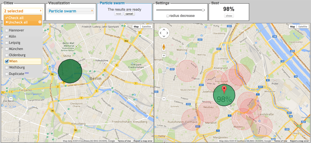 In the example shown in Figure 9, the user intends to find the most suitable region in Vienna with respect to a specified region in Berlin (query region). Hence, the user selected a circular region of interest on the Berlin city map. Once the user has provided her area of interest, the system triggers several particles in the city map of Vienna. Each particle has the same diameter as the query region. These particles start moving across the Vienna map to find the best region with respect to the user’s criteria. Users could view the particles and swarm movement on the map interface, and they could also control the speed of the swarm via the top panel of the interface. Here, they could also spot the current status (found similarity) of the search process. The swarm would keep searching the map space until it discovers the best region with the highest possible similarity or if the user terminates the search process. In this example, the user terminated the search process when the swarm had found a region with 98% similarity. The best region is indicated with the dark green color and its similarity value. The transparent red circles are showing the last positions of particles when the search process was stopped.
