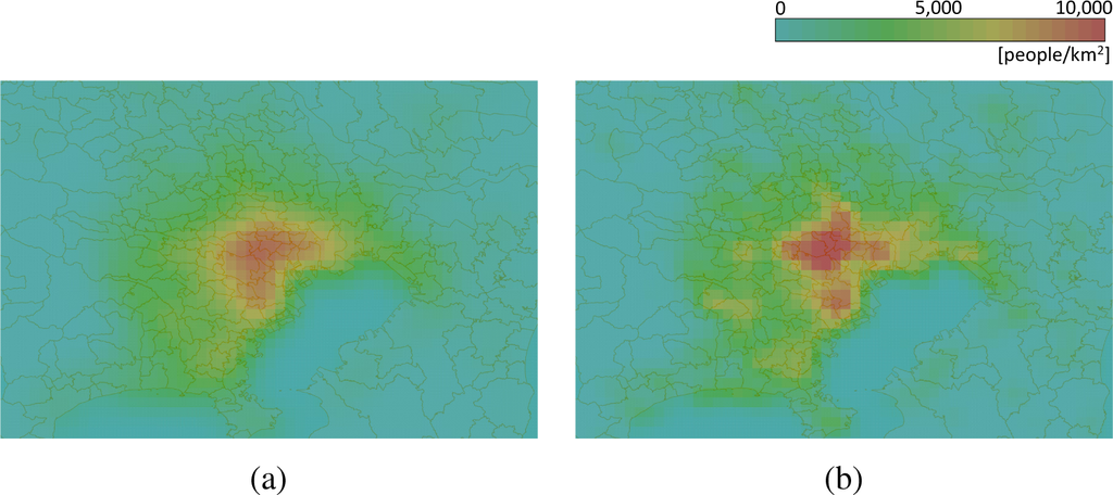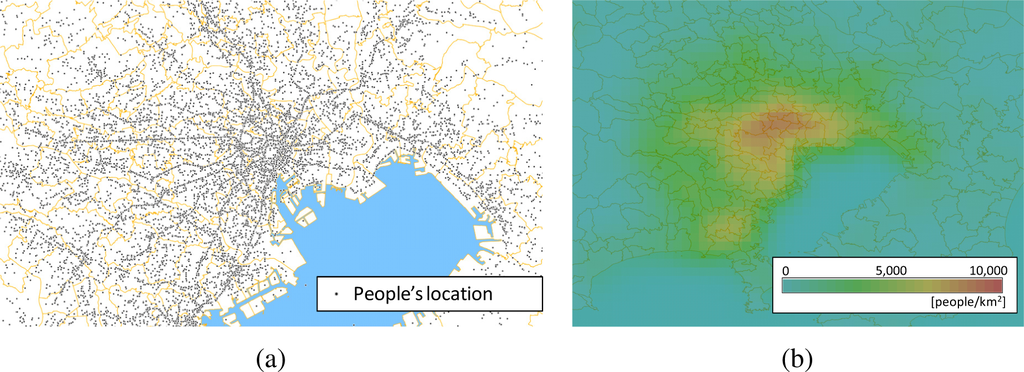 Population density, namely the number of people per unit area, is one of the most effective factors in decision making involved in tasks, like infrastructure management, city development planning and merchandising [1]. For example, police officers can optimize their patrols in a city on the basis of high-population density locations, because accidents often occur at those locations in cities. A dataset of people’s positions, consisting of “moving points”, as the example in Figure 1a, can be used to calculate the population density. Figure 1a was drawn by plotting the results of questionnaires about people’s journeys (namely, data pairs consisting of origination and destination pairs of the travels) during a whole day on a base map [2]. The drawing thus represents people’s positions at the moment in the past. In contrast, the people’s positions measured in real time through mobile phones with GPS-like positioning functions [3,4] reflect people’s movements. In that case, the people’s positions are thus recorded in real time as moving points. Such massive data about people’s positions should be commonly used, because they should be taken into account for many decisions, such as devising patrol plans for police officers. The OGC (Open Geospatial Consortium [5]), which is an international standard organization concerned with geospatial information systems, publishes standard specifications applicable to such data. A standard for encoding such massive moving-point data is defined as “OGC Moving Features encoding” [6], which is defined for exchanging massive amounts of moving-point data easily.