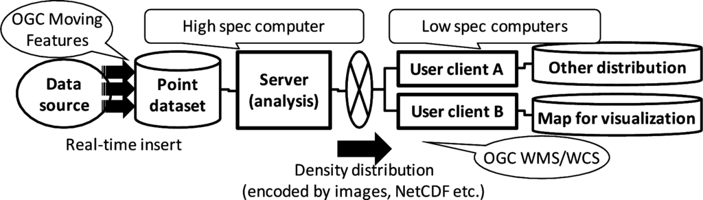 Another problem with histograms arises in practical data-providing systems. An example of a client-server system using point density is shown in Figure 2. The data source periodically provides a real-time point dataset to the analysis server. The server estimates the point density and sends it to user-client systems A and B. The user clients use the point density by associating it with other information, such as temperature distribution and map illustrations. In this case, the server is basically a “high-spec” computer; in contrast, the user clients are generally “low-spec” computers. For such systems, OGC standards are available. Namely, OGC WMS [9] is a service interface for distributing map images, and OGC WCS (Web Coverage Service) [12] is a service interface for distributing coverage data. They provide web APIs to send the point density data. WMS-request data sent from user-client systems include the area boundary of the required map and the map-image size, which determine the image resolution. The resolution required by user-client A might be different from that required by user-client B; besides, the required resolution dynamically changes according to the user requirements. The point density must thus be dynamically calculated.
