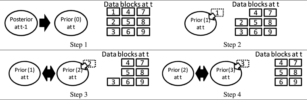 Figure 3 illustrates such a judgment process. The point dataset is separated into small blocks in advance, where the block size is a constant parameter during the process. Note that the block size should be large enough to detect statistical significance. In Step 1, the prior is generated from the adjacent past posterior. In Step 2, to estimate the posterior, one of the small blocks (labeled “1”) is input into the prior. In Step 3, the next prior, which is generated by the estimated posterior in Step 2, is updated with the block labeled “2”. In this step, KL divergence from the posterior generated in Step 2 to the posterior generated in Step 3 is calculated. If the KL divergence is small enough, additional blocks are judged unnecessary. If not, the posterior is similarly calculated, and so on. In the evaluation of KL-divergence, the number of the input data is controlled; that is, few data are used when the point density changes a little, but many data are used when the point density changes drastically.