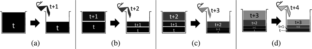 The updating mechanism is figuratively drawn as an “evaporating pot” in Figure 4. In Step (a), the pot is filled by a liquid, labeled t. The content of the pot is then evaporated so that half of its capacity remains. Next, a new liquid, labeled t + 1, is poured into the pot. The volume of the poured liquid is half of the pot capacity. In step (b), the contents of the pot are again evaporated to half its capacity. The liquid labeled t and the liquid labeled t + 1 are reduced equally to half of their initial volumes. That is, the volumes of the liquids labeled t and t + 1 become 1/4 of the pot capacity. Then, repeatedly, a new liquid, labeled by t + 2, is poured into the pot, which is half full of the liquid. After repeating the process, as shown in Steps (c) and (d), the ingredients in the pot are a mixture of liquids labeled t, t + 1, …. The volume of liquid labeled t′ is therefore V, where V is the pot capacity. Thus, the volume of liquid will be decreased exponentially.
