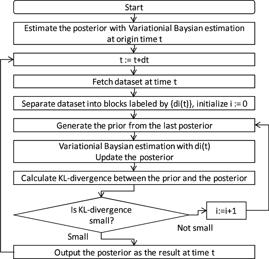 The proposed algorithm is shown in Figure 5. A normal variational Bayesian estimation is carried out first. The estimated posterior at time t is used to generate the prior at the next time t+1. Each dataset is separated into many blocks, and the blocks are sequentially input to update the prior generated by the last estimated posterior. The block intromission is stopped when the KL divergence between the prior and the posterior is small enough. When that condition is met, the estimation of the point density at time t is finished. After the estimation, time t is incremented into t+ 1, and the estimation of the point density at time t + 1 is started. These processes are carried out iteratively to estimate the point density.