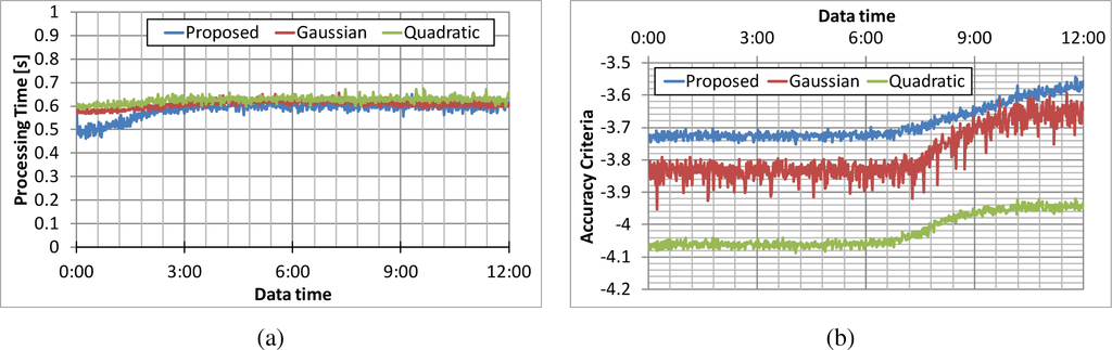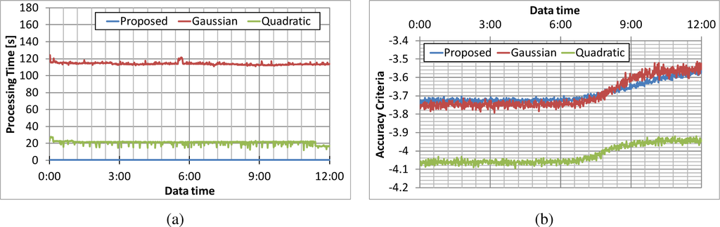 For ensuring these results, Ev’s of the Gaussian-kernel estimator and the quadratic-kernel estimator under various h’s are calculated with 10,000 points at 0:00 a.m.. In the case of the Gaussian-kernel estimator, Ev = −∞ at h = 0.05, Ev = −4.00 at h = 0.1, Ev = −4.11 at h = 0.2, Ev = −4.28 at h = 0.5 and Ev = −4.41 at h = 1.0. Similarly, in the case of the quadratic-kernel, Ev = −∞ at h = 1.0, Ev = −∞ at h = 2.0, Ev = −4.40 at h = 3.0, Ev = −4.47 at h = 4.0 and Ev = −4.53 at h = 5.0. The Ev shown in the Figure 9b are comparable with these Ev. In addition, the proposed algorithm achieved Ev = −3.79, which is also comparable with Ev shown in Figure 9b. That implies that the evaluation setting like h and the number of point data are not significant for the accuracy evaluation.