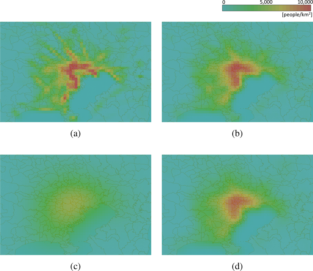 “Coverage data,” which describes the point density, are one of the most easily handleable kinds of data. The coverage can be encoded by various encoding standards, like OGC NetCDF [7] and GML [8]. Figure 1b shows a population density distribution visualized from the points shown in (a). Such an intelligible image colored according to density, often called a “heatmap,” can be generated automatically (Figure 1b is generated by a quadratic kernel density estimator shown in Section 2.) After visualization, the heatmaps can be encoded by general image formats, like PNG and JPG. For distributing such images, an OGC WMS (Web Map Service) [9] interface is commonly used. Accordingly, a conversion from point data to a coverage would contribute to system interoperability.