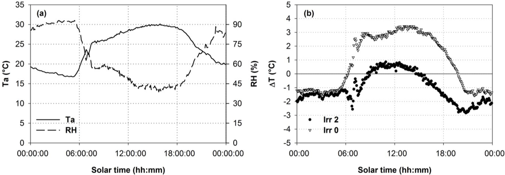 The diurnal courses of ΔT continuously monitored on the day of the airborne overpasses are shown in Figure 2.