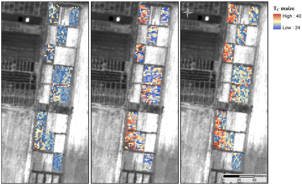 Maps of Tc computed for each overpass over the 24 maize plots are shown in Figure 4.