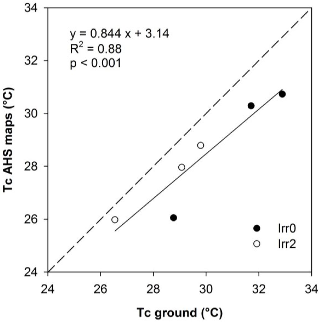 The accuracy of the maps has been evaluated comparing the average Tc value measured on ground at the time of the three overpasses with the average value extracted from the airborne Tc maps for each of the two plots and time of the day. The two Tc estimates agreed well (R2 = 0.88, p < 0.001) (Figure 5). Tc estimated from the airborne sensor are slightly lower than those measured on ground and the underestimation tends to increase with Tc (slope of the regression line equal to 0.88). Differences can be partly due to different viewing geometries, with ground measurements observing the crop with a view angle of 45° and airborne instrument observing it from nadir.