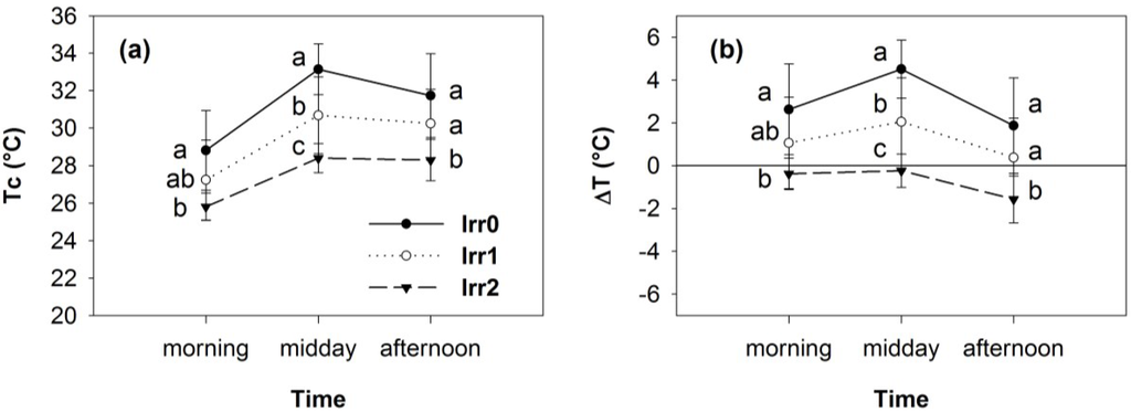 Time courses of average Tc (°C) (a) and ΔT (b) for the three water treatments. Vertical bars are ± one standard deviation. Tc and ΔT were analyzed with the non-parametric Kruskal–Wallis test. The results of the test are evidenced by letters on the plots. Statistically different (p < 0.05) medians are designated with different letters.