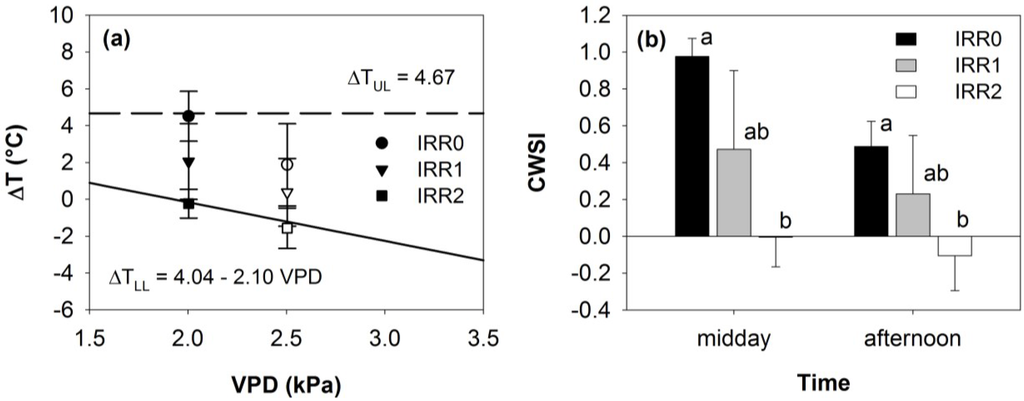 Finally, the CWSI was computed based on the ΔT maps acquired around midday and in the afternoon using the lower and upper limits of the relationships between ΔT and VPD shown in Figure 7a. CWSI is able to detect a significant difference between well irrigated and severely stressed plots in both the midday and afternoon flights (Figure 7b). Considering the midday flight, the average CWSI value ranged from 1 in Irr0 plots to a value close to 0 in Irr2 plots. During the afternoon, the average CWSI value decreased in the three treatments indicating that maize plants are better able to adjust the evaporative cooling in response to increased VPD.
