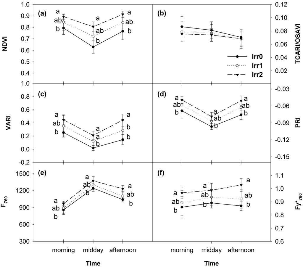 Time courses of NDVI (a); TCARI/OSAVI (b); VARI (c); PRI (d); F760 (e) and Fy*760 (f) for the three water treatments. Vertical bars are ± one standard deviation. Vegetation indices and fluorescence were analyzed with the non-parametric Kruskal–Wallis test. The results of the test are evidenced by letters on the plots. Statistically different (p < 0.05) means are designated with different letters.