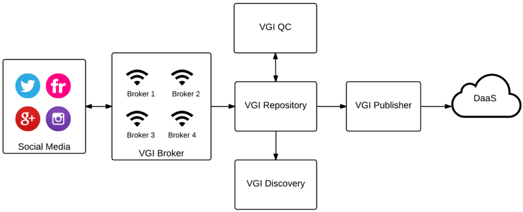 The VGI Broker provides a service interface to find and collate user-generated content from various social media platforms. Many social media platforms provide public APIs for clients to interact with them using their specific request-response message system. Although they usually adopt REST (REpresentational State Transfer)-based interfaces and support popular data formats (e.g., JSON or XML), there is no uniform description of service interfaces and data encodings [10]. Hence, the VGI Broker module connects the platform user to different APIs, enabling data retrieval from multiple social media platforms via a single service interface. It translates a single query to multiple API-based queries and handles different request-response data formats. The retrieved data is then stored in the VGI Repository based on the data models designed for each platform (e.g., Twitter, Flickr, etc.).
