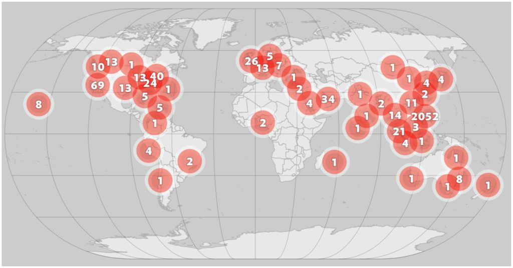 Positional Nearness: We collected about 117,300 contributions from the four different data sources, Twitter, Flickr, Google Plus, and Instagram, that referenced Typhoon Ruby [75]. Of these contributions, only 2,440 (~2%) were geo-tagged with coordinate (location) information. In Table 3 we show the number of contributions for each positional nearness score (PNS) according to their source. PNS level 1 contributions were not geo-referenced. It appears that for this case study we had only two geo-referenced contributions from both Flickr and Google Plus. Hence, Google Plus provided the lowest proportion of geo-tagged content (2 out of 935 ~ 0.2%), followed by Twitter (440 out of 110,249 ~ 0.3%), then Flickr (2 out of 66 ~ 3.0%), with Instagram providing a significantly greater proportion of geo-tagged contributions (1,996 out of 6,022 ~ 33.1%). A 2-sample test for equality of proportions was carried out indicating a significant difference between the two proportions . Three of the data streams, Twitter, Flickr, and Google Plus, were conflated as both Flickr and Google Plus provided fewer than five contributions with coordinates, which could result in an unreliable solution. There was also no significant difference between the count proportions for those services. The greater proportion of geo-tagged Instagram contributions can be partially explained by the fact that Instagram’s users can only publish photos and videos via their mobile phones, whereby Instagram may deduce spatial information from the users’ GPS or IP addresses. Figure 3 shows the spatial distribution of the retrieved data from social media.