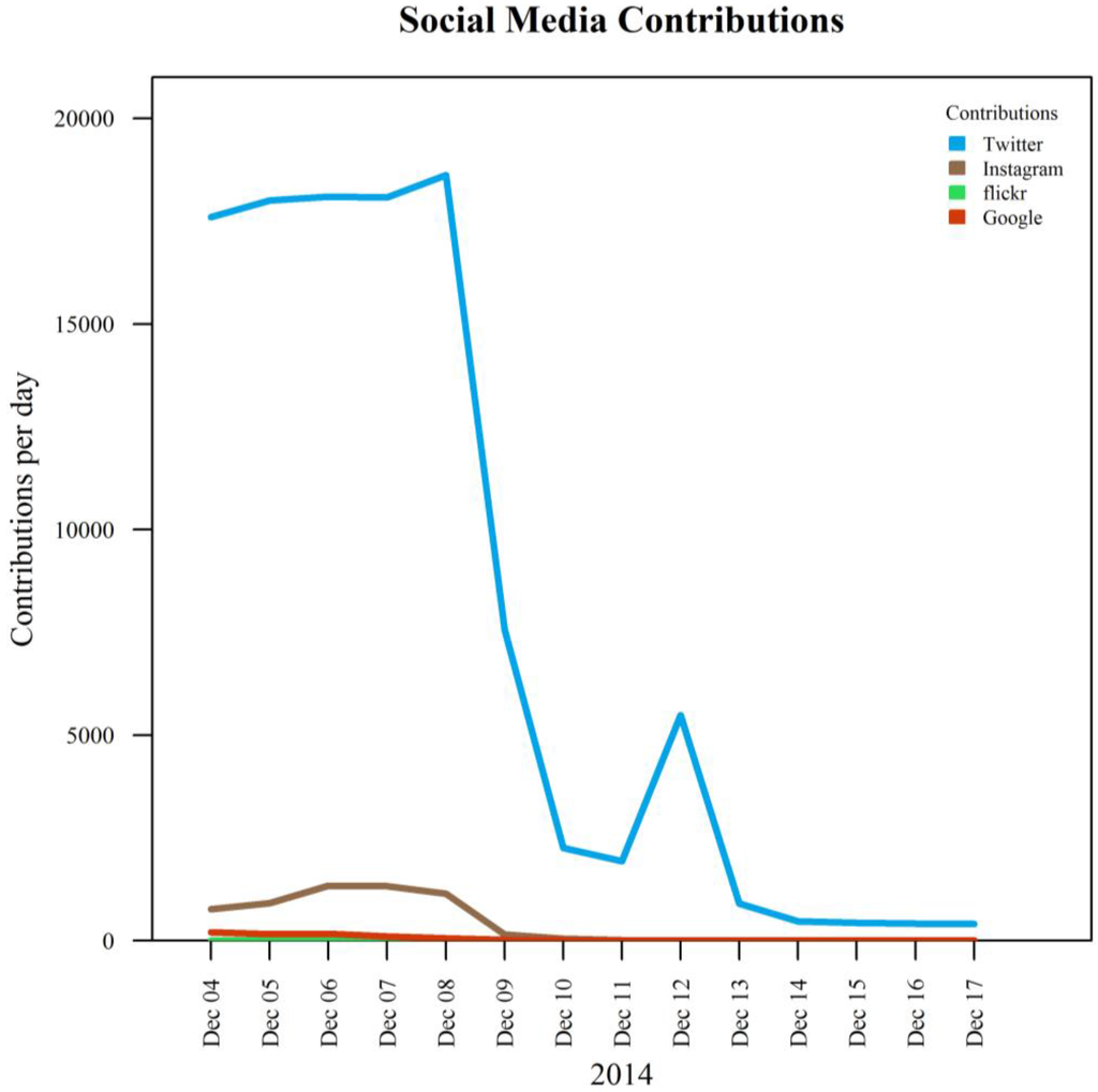 We collected user-generated content from Twitter, Flickr, Google Plus, and Instagram using the VGI Broker between 4 December and 17 December 2014 based on a set of predefined search parameters, hashtags, and keywords (see Table 2). Four brokers were implemented using the social media platforms’ Python API using HTTP GET/POST requests. The brokers were then wrapped using GeoServer WPS and exposed as a set of standard WPS instances. We designed a data model for each social media dataset and deployed four PostgreSQL/PostGIS databases to store and manage the incoming data stream. Table 2 lists the Python APIs used to develop the brokers and the search parameters used to invoke them. It should be noted that the search parameters were chosen through an initial investigation of each social media platform's public stream to find a relevant sample of data with relatively little noise.