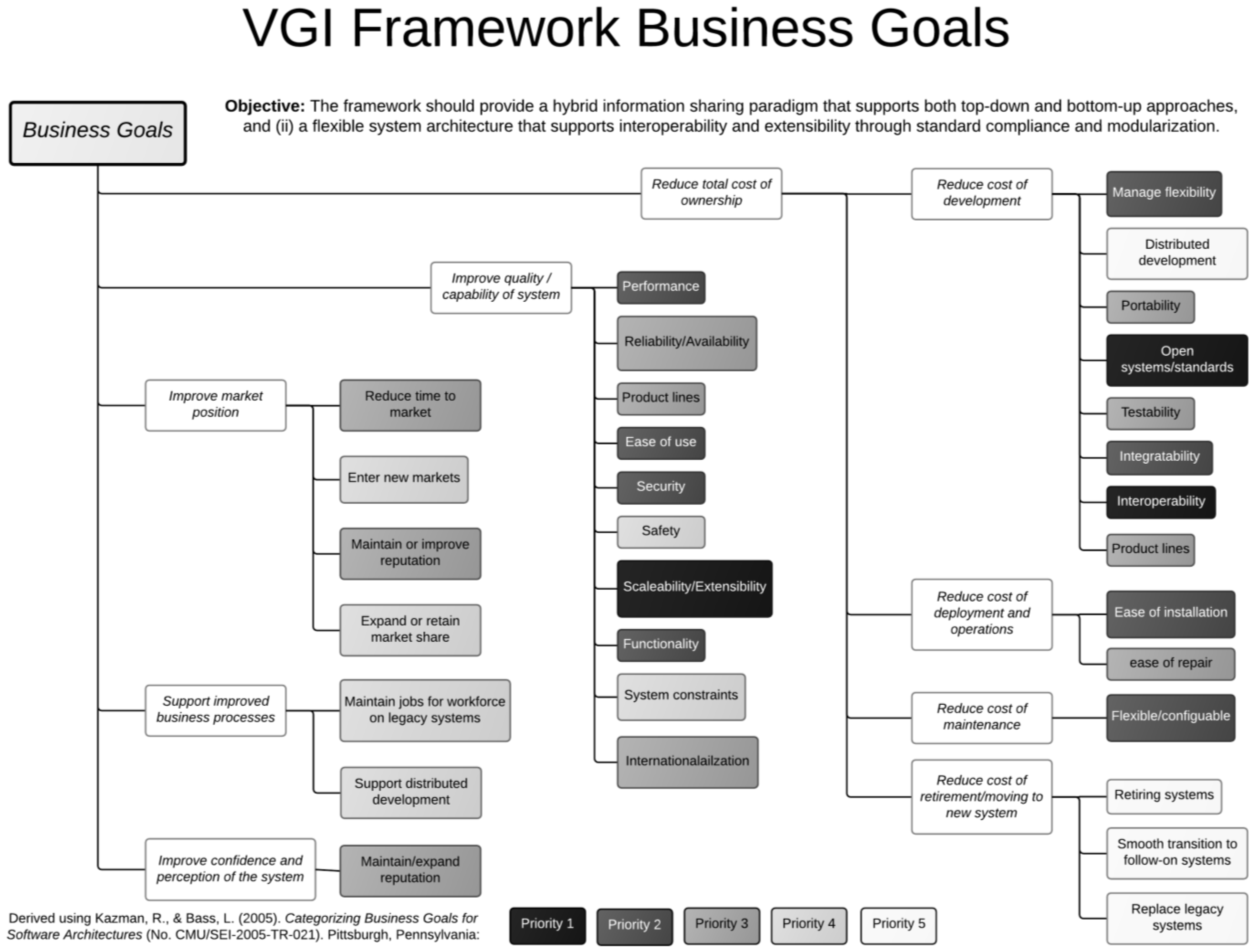 During the framework/platform design phase, first priority was given to the following quality attributes: (a) scalability/extensibility, (b) open systems/standards, and (c) interoperability. These attributes ensure that systems built using the VGI framework will work together efficiently, and that a set of services developed using this framework will be coherent, and at the same time will address legitimate disaster management issues such as crisis information sharing. The secondary design priorities were: (d) performance, (e) flexibility, (f) integrability, (g) security, (h) ease-of-installation, (i) ease-of-use, and (j) portability. These criteria focus on system capability and quality. Furthermore, there are additional low-level priorities, such as (k) distributed development and (l) ease-of-repair, along with a number of quality metrics (see Appendix) that should ideally be satisfied to achieve all business goals. In the following sections, we discuss the conceptual design of the framework, technical architecture, and implementation details.