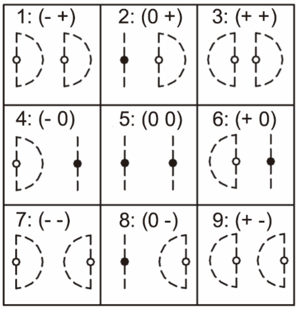 | {(+ -) ==> (0 0) ==> (- +)} | {(+ -) ==> (0 0) ==> (- +)} | {(+ -) ==> (0 0) ==> (- +)} | {(- -) ==> (0 0) ==> (+ +)} | {(- -) ==> (0 0) ==> (+ +)} |