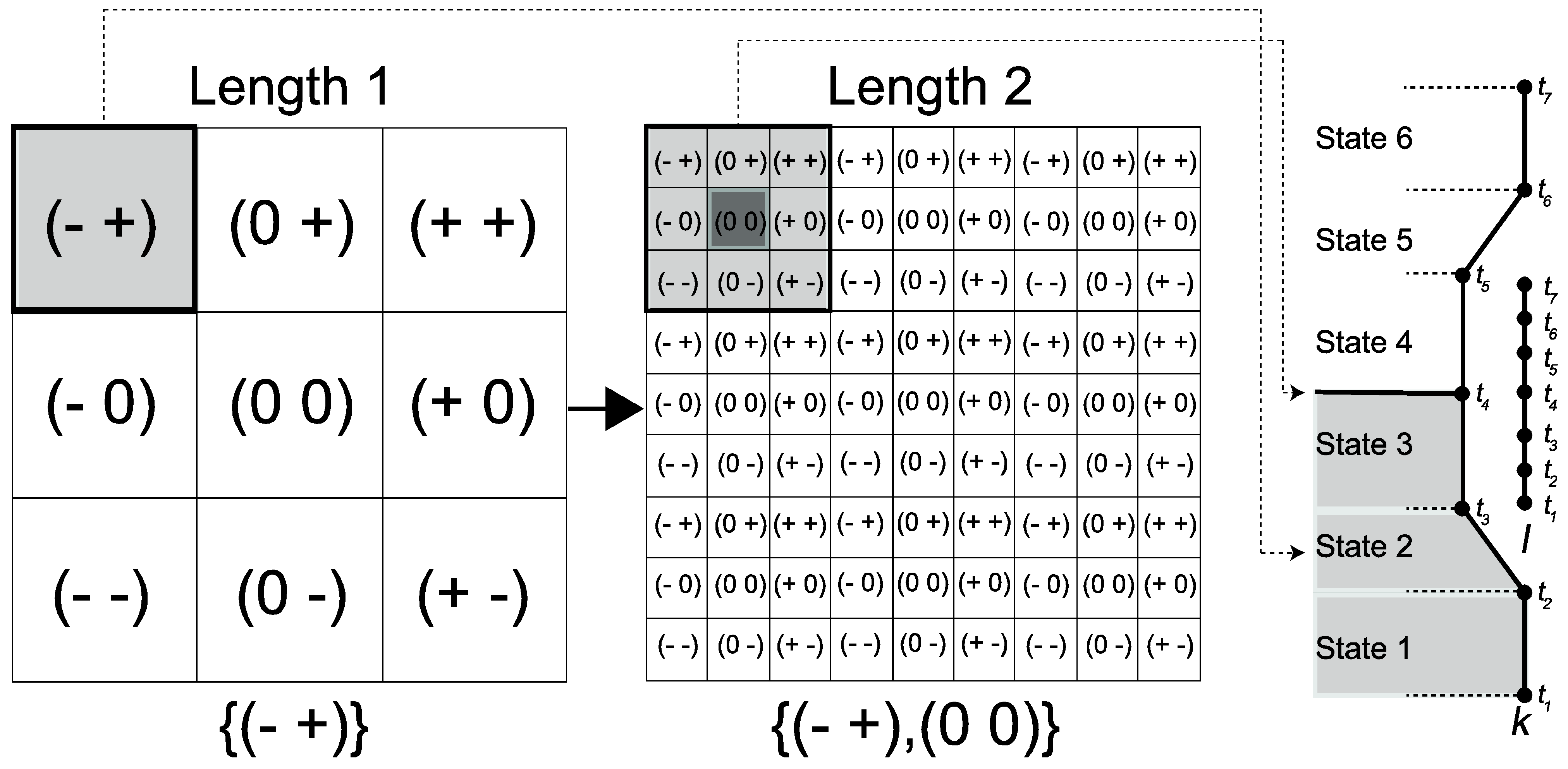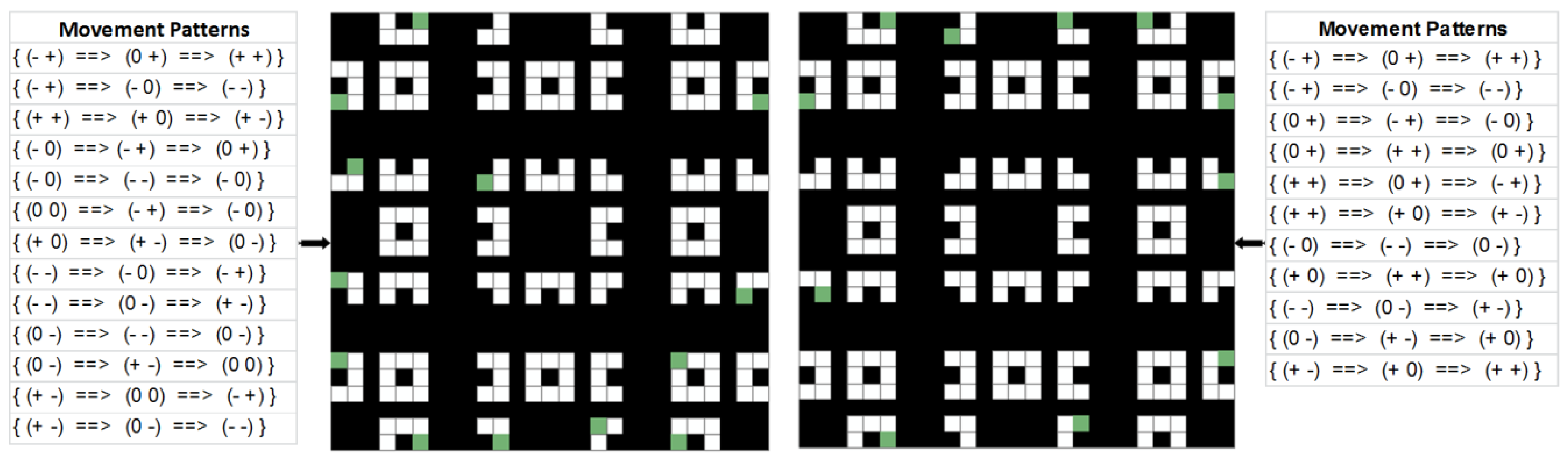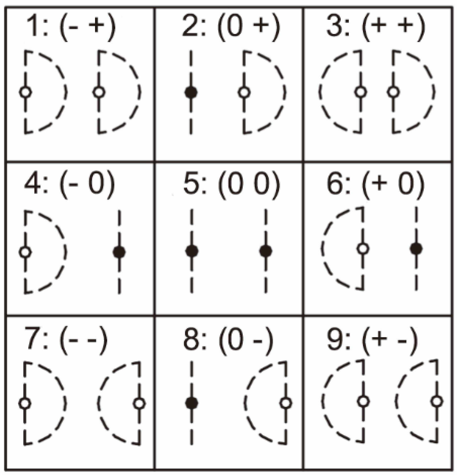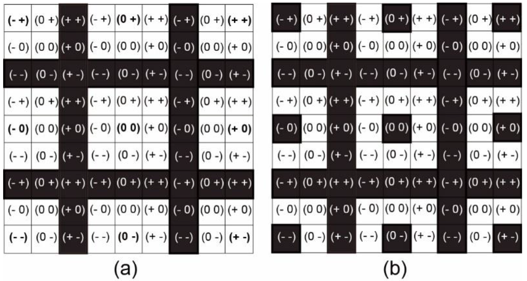 | { (+ -) ==> (00)} | { (+ -) ==> (00)} | { (+ -) ==> (00)} | { (- -) ==> (00)} | { (- -) ==> (00)} |