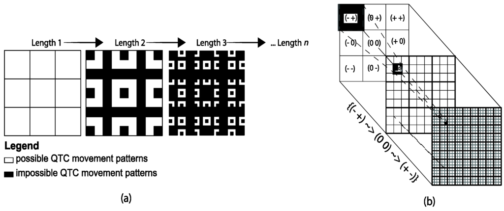 The black cells indicate discontinuous (and thus impossible) sequences of qualitative relationships between two MPOs. For example, it is not possible to have a direct transition from to relationships , and . Second, because we are typically interested in the changes in the relative motion between the MPOs over time (i.e., events), some sequences of qualitative relationships are not significant. This arrangement is the case when a QTCB relationship is invariant over time. For example, a transition from into itself is not very meaningful from a qualitative perspective. Figure 3b shows the result of imposing both of the above restrictions on a SESI of length two. For illustrative purposes, we also provide the representations of SESIs of lengths 1 to 3 in Figure 4a along with the SESI representation of the overtake event given in Equation (5) (Figure 4b). The fractal approach outlined above offers an insightful way to address repetitive movement patterns of any length.