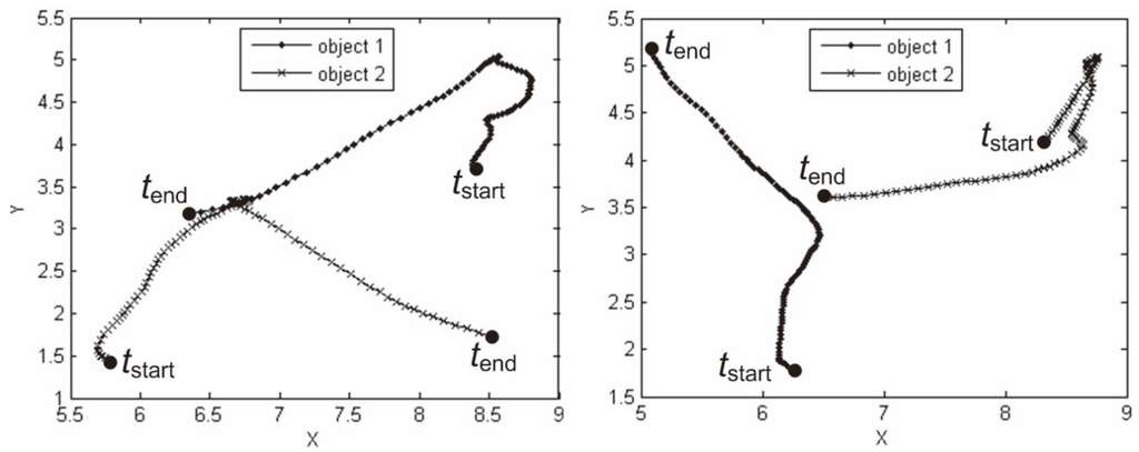 Normalization is used to scale heterogeneous frequencies of QTCB movement patterns, to make it possible to compare them. As a result, the normalized frequency of each cell of a SESI is confined to the interval [0, 1]. To calculate the distance between two SESIs, we start from the top left cells in both SESIs to subtract their normalized frequencies from each other. The distance measure in Equation (6) runs over all of the cells in the SESIs. The denominator in Equation (6) represents the number of feasible sequences of QTC relationships in that SESI. By definition, infeasible sequences are assigned a frequency of 0. For example, there are 529 impossible cells in a SESI of length 3. The distance function in Equation (6) ranges from 0 to 1, where 0 indicates that the SESIs are identical and 1 indicates that there is no correspondence at all between the SESIs. In fact, dn is an indicator expressing to what extent QTC movement patterns of a pair of MPOs (with length n) are different from the QTCB movement patterns of another pair. As an illustration, Figure 5 depicts two arbitrary trajectory pairs of two objects during two different time intervals. The SESIs of length 3 for both trajectory pairs are shown in Figure 6. The black cells indicate impossible cells, whereas the green cells display the frequency of the movement patterns. In this simple example, the frequency of occurrence of a movement pattern is either 0 or 1. The distance between these two SESIs can be calculated based on Equation (6):