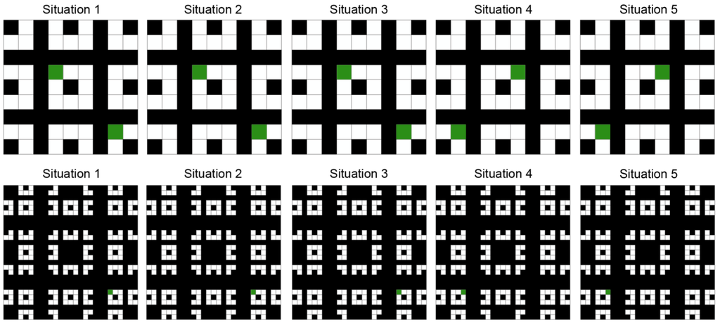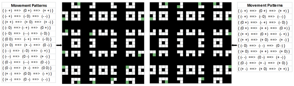 A sequence signature (SESI) is a fractal way of mapping patterns of the interactions between two MPOs in an indexed raster space. It is based on an iterated function system, as discussed in detail in Barnsley (1988) []. In a SESI, each sequence of n consecutive qualitative relationships is represented by a cell of length n (i.e., the number of subsequent QTCB relationships that constitute a movement pattern). Thus, a SESI of length 1 represents movement patterns that are composed of one QTCB relation, while, for example, a SESI of length 5 represents movement patterns that are composed of five consecutive QTCB relations. The resolution of these cells depends on the length of that SESI.