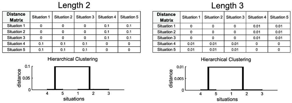 Distance matrices and hierarchical clustering of five traffic situations (five trajectory pairs) for SESIs of lengths 2 and 3 based on the distance function in Equation (6).