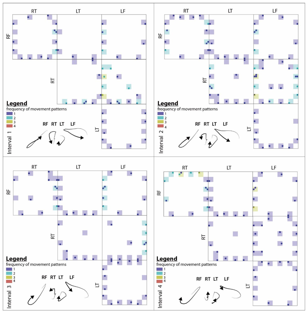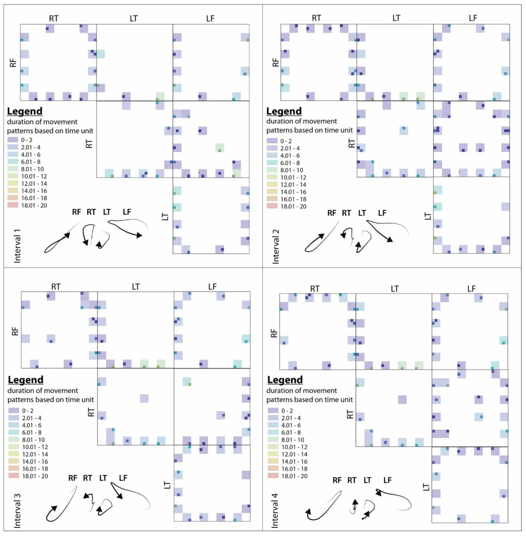 Hyper-SESIs of four equal time intervals of movements based on the frequency of QTCB movement patterns.