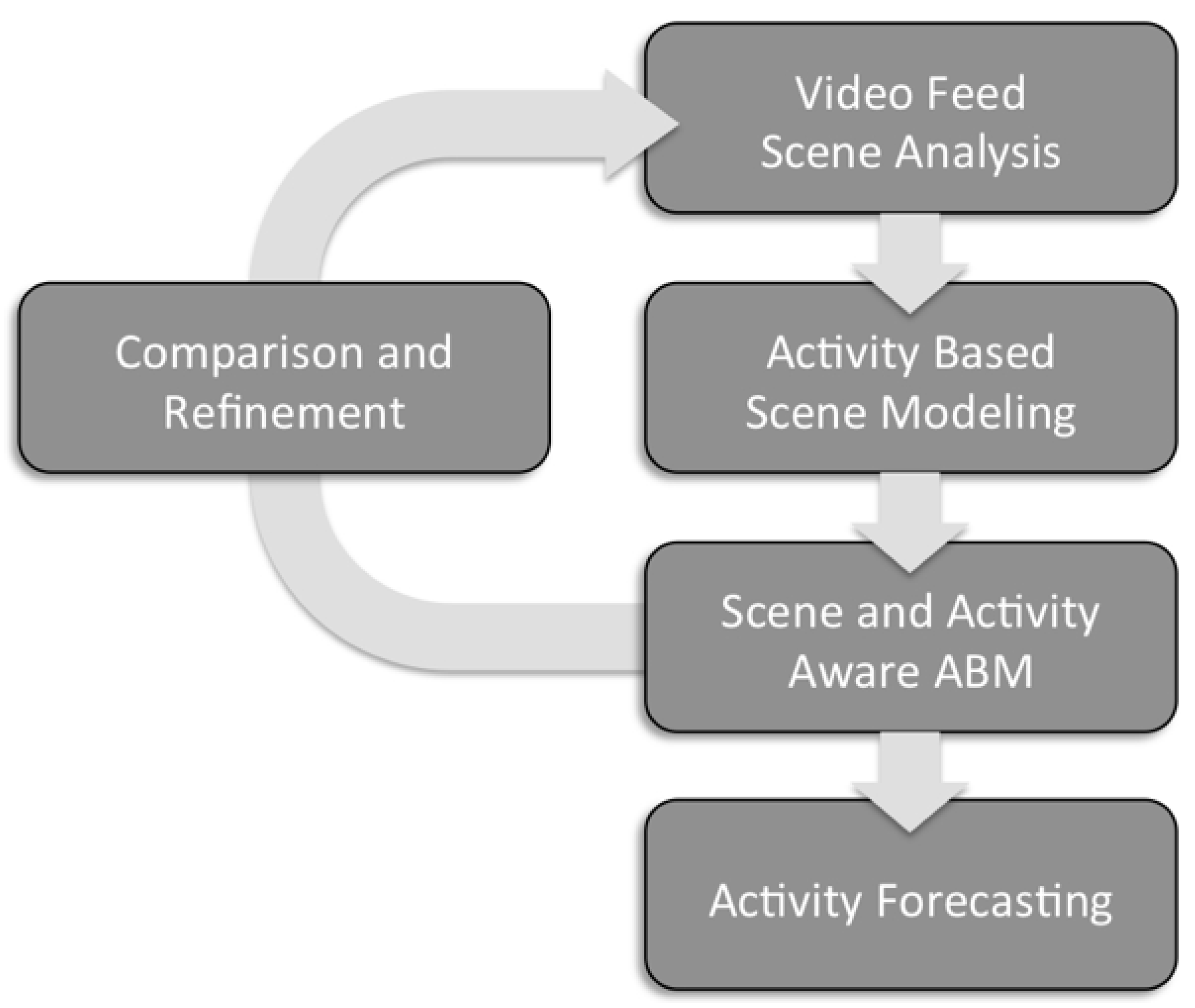 The proposed approach takes advantage of the proliferation of video surveillance technologies, by harvesting activity information from video-derived trajectories and using it to inform an ABM for the depicted scene. By doing so we gain substantial and non-trivial knowledge about the depicted scene, recognizing for example important patterns of activity, and gaining a greater understanding on how humans use the scene in everyday life. This allows us to move beyond simply exploring the scene geometry (i.e., the form of the scene) to taking into account the scene’s function as it is reflected through the patterns of movement in that scene.