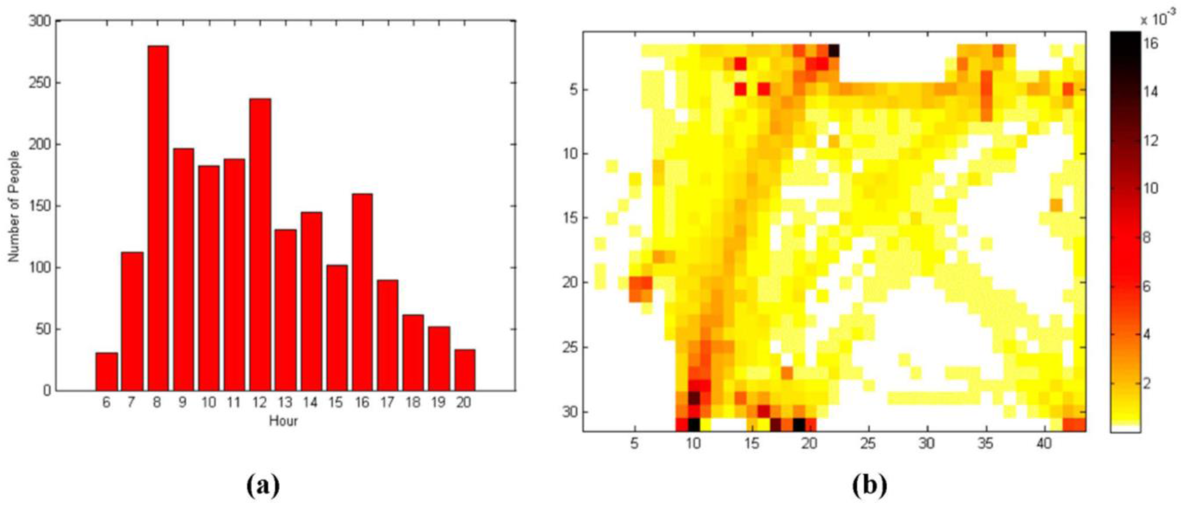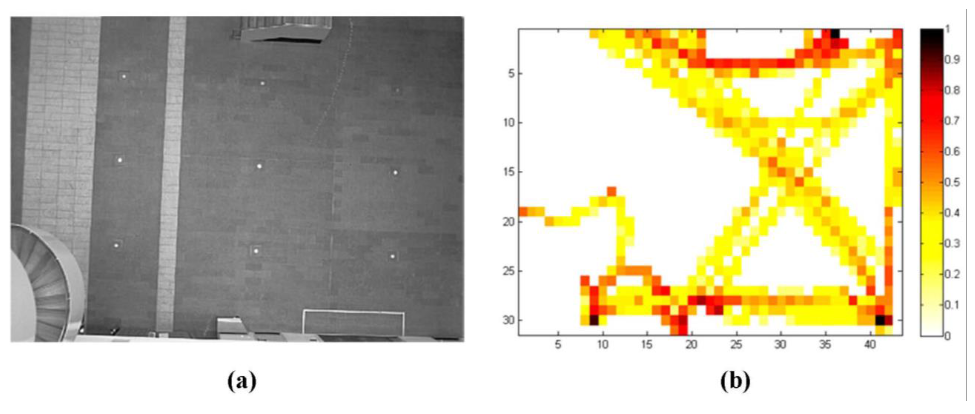 where cross(x,y) is the number of trajectories that cross cell (x,y), min(cross(⋅,⋅)) (and max(cross(⋅,⋅))) are the minimum (and maximum respectably) among the set of all crossing values cross(⋅,⋅) in our scene. In this equation (⋅,⋅) refers to two cells between which a crossing occurs. Figure 2 shows the physical scene (left) and its corresponding activity heat map (right). Heat maps are often used for analyzing indoor and outdoor space activity (e.g., [55,57]). For our methodology, heat maps offer two distinct advantages. First, it naturally conveys knowledge about the scene: as an example, it allows us to identify popular paths (connecting the lower right to the top left in Figure 2). Second, it allows us to visualize connections in space: each cell has 8 neighbors (e.g., the Moore neighborhood), and by comparing the corresponding heat values, we can calculate an informed estimate on the most likely next step given a location along a trajectory, which is particularly suitable for the simulation problem that we are addressing (see Section 4.4.2). We complement this heat map with entrance and exit locations for our scene (identified trivially as clusters of locations where trajectories start and end respectively) and a frequency table showing entrance-exit connections (also identified trivially from the trajectories) to provide a comprehensive yet easy to use activity-based model of our scene that will drive the application of our SA2-ABM.