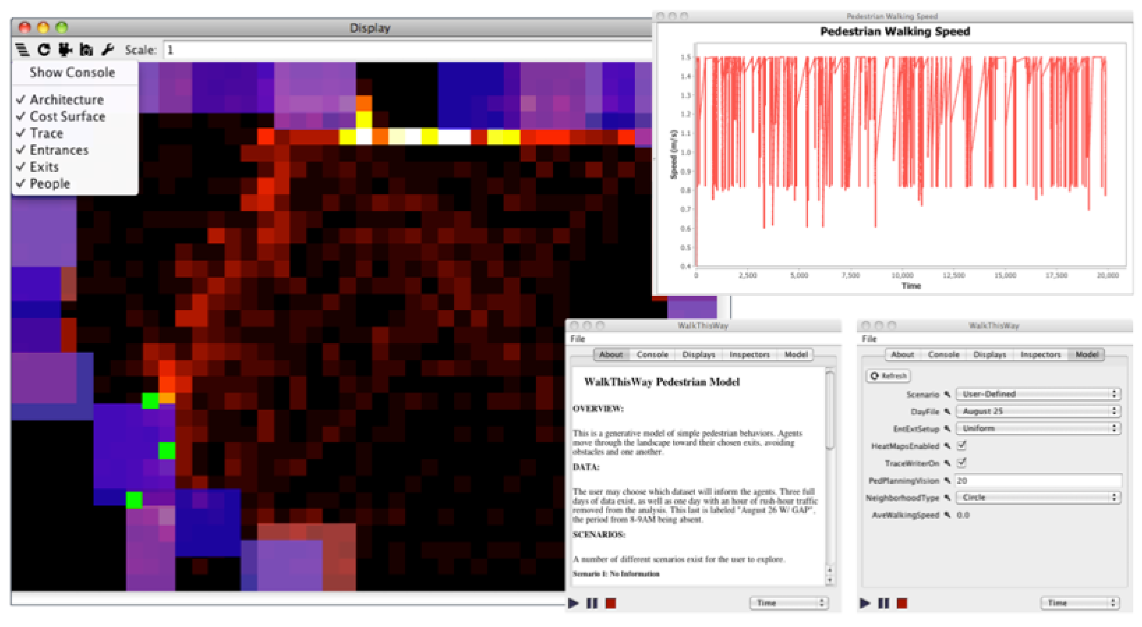 The SA2-ABM is programmed in Java using and extending the MASON Simulation toolkit [64]. We have provided an executable of the model, source code, and all data presented in this paper at https://www.openabm.org/model/4706/version/1 to aid replication and experimentation. In Figure 3 we show the graphical user interface (GUI) of the model. Clockwise from the top left, the GUI features a map with the option to view or hide any layer of data, a graph that summarizes walking speeds over time, and the model controller. The model controller allows the user to initialize, pause, or stop the simulation, control which displays are hidden or shown, and view some basic model information along with running the different scenarios presented below. Such an interface allows for ease of use in understanding and debugging the model [65].