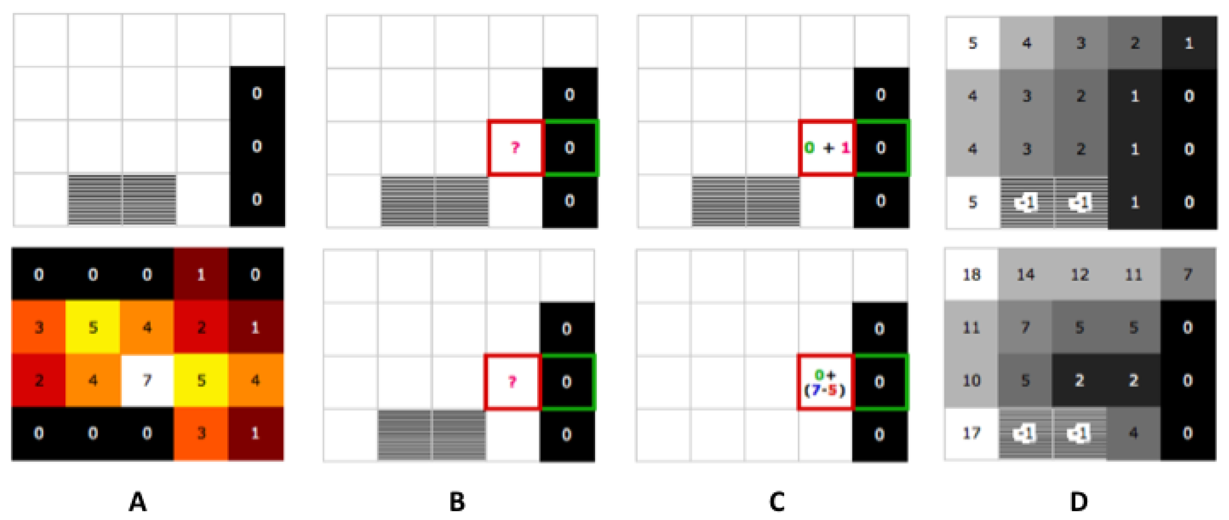 Our simulation is addressing pedestrian agents. Pedestrian objects have a physical presence, in that they uniquely occupy a location in the environment, as well as an eventual destination point through which they intend to exit the simulation. The goal of these agents is to move towards their exit locations as quickly as possible. They do so via the shortest path, however, this path can change if obstacles (such as other pedestrians) are encountered along the way (see Section 4.4.2). They are constrained in reaching this goal by the presence of other agents or obstacles in the simulation and their maximal walking speed; their ability to plan their future paths is limited by their “vision” which in this case is 7.5 m (the extent of the area being modeled), or the distance in front of themselves they can look when planning their course. In the course of developing the model we explored a range of vision parameters from 1 cell ahead to the whole scene. Setting the vision to a low value resulted in unrealistic walking patterns and as this is a flat and relatively small open scene we thought it was appropriate to give the agents the full visual range of the area. Agents are situated within an environment that contains immobile obstacles (staircases, information booths, fountains, etc.) as well as mobile obstacles (other pedestrians). Pedestrians are also aware of less tangible aspects of the situation: they know how frequently other pedestrians in the past have passed through various locations in moving from a given entrance to a given exit. Heat maps derived through scene activity can provide this information. This is akin to the notion of the emergence of a trail system whereby paths are manifested without planning or communication from users [75], in the sense that paths through a grassy field develop even when the field offers no substantial obstacle and a more direct but less-trodden path may be provably shorter. Agents’ choices to move in accordance with the heat map have several natural analogs in the real-world, including the way individuals copy the behavior of others who are walking ahead of them or the way that patterns of movement can eventually trace out a footpath or other physical indication of the passage of others, signaling where to walk. This does not necessarily mean that pedestrians seek crowded places, but rather that they tend to follow prior trails. This information is combined with the explicit distance between a given location and the goal point to form a gradient, down which the agent moves toward its goal. Part of the research done here focuses on how the construction of such gradients (Section 4.4.2) influences the emergent macro-scale patterns of movement over the course of the simulation, and which gradients result in realistic patterns of movement.
