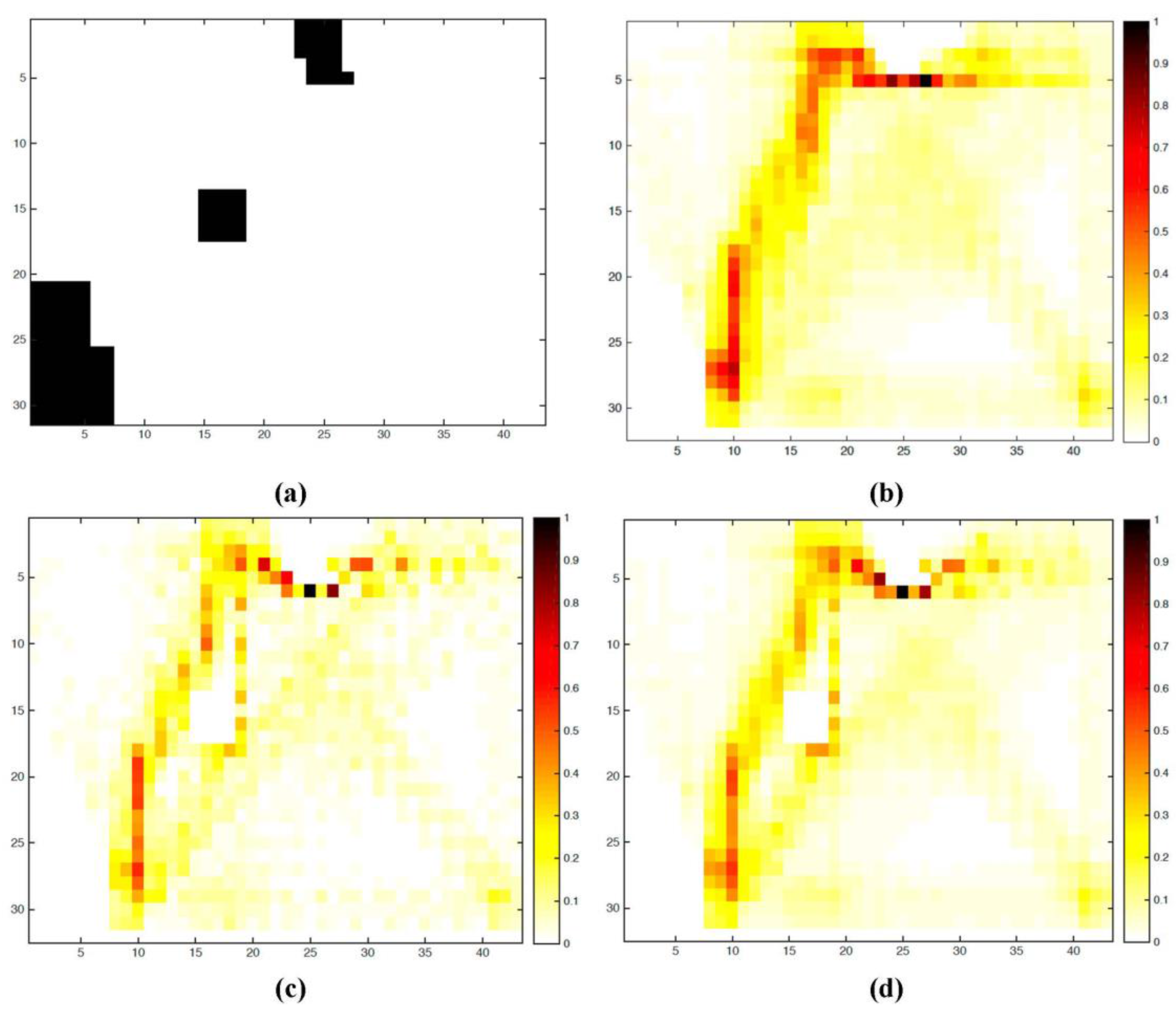 As the aggregate tracking information we have is in the form of a heat map [56], and since the objective of the ABM in the context of this publication is also to generate patterns of movement at the aggregate level, we chose to proceed by using activity heat maps as aggregate spatiotemporal expressions of trajectories crossing a scene of interest. This facilitates a direct comparison between the pedestrian model and the scene data. An activity heat map expresses how frequently a specific location in a scene is visited by a trajectory. For example, let us assume that we have as input for our analysis a set of m trajectories captured in a scene: