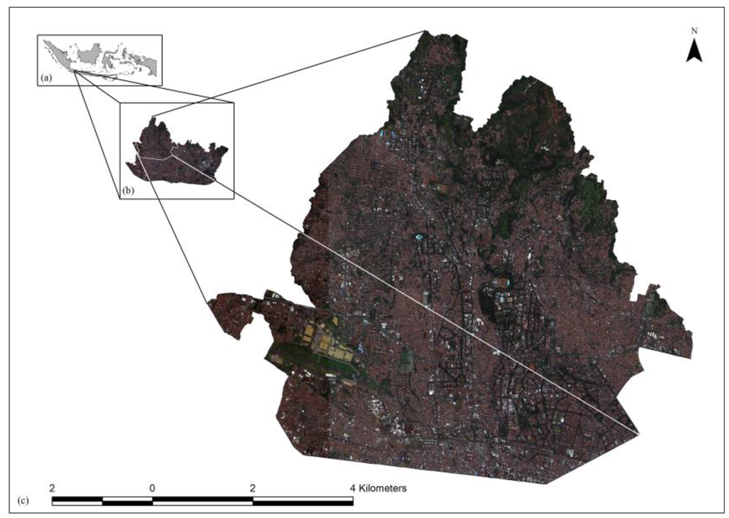(a) Map of Indonesia showing the approximate location of northern Bandung city; (b) Bandung city and the white border of study area; (c) Pan-sharpened Worldview 2 satellite image, red, green, blue (RGB) color composite showing the area depicted in high resolution satellite imagery.